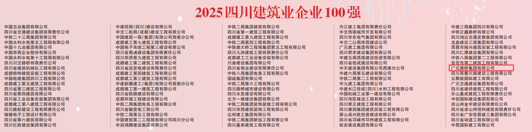 2025年10月23日,四川省企業(yè)聯(lián)合會、四川省企業(yè)家協(xié)會首次發(fā)布2025四川建筑業(yè)企業(yè)100強名單,路橋集團成功入圍。