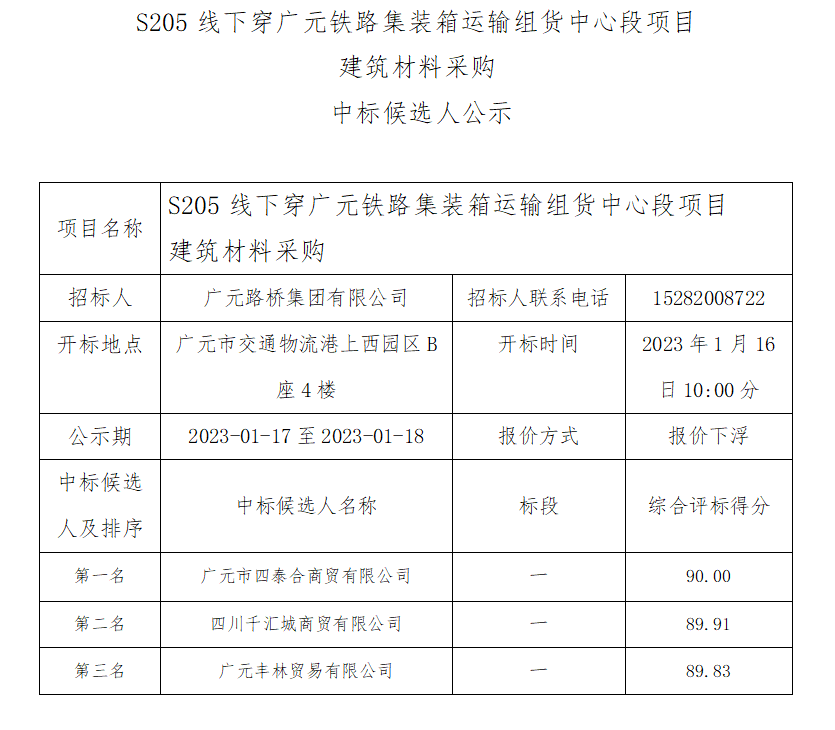 廣元路橋集團有限公司S205線下穿廣元鐵路集裝箱運輸 組貨中心段項目建筑材料采購中標(biāo)候選人公示